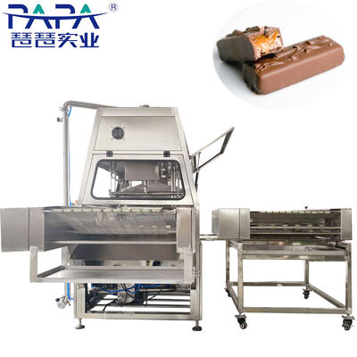 Questa macchina professionale per ricopertura al cioccolato è progettata specificamente per il rivestimento efficiente e uniforme di barrette Snickers e altre barrette di cioccolato ripiene.